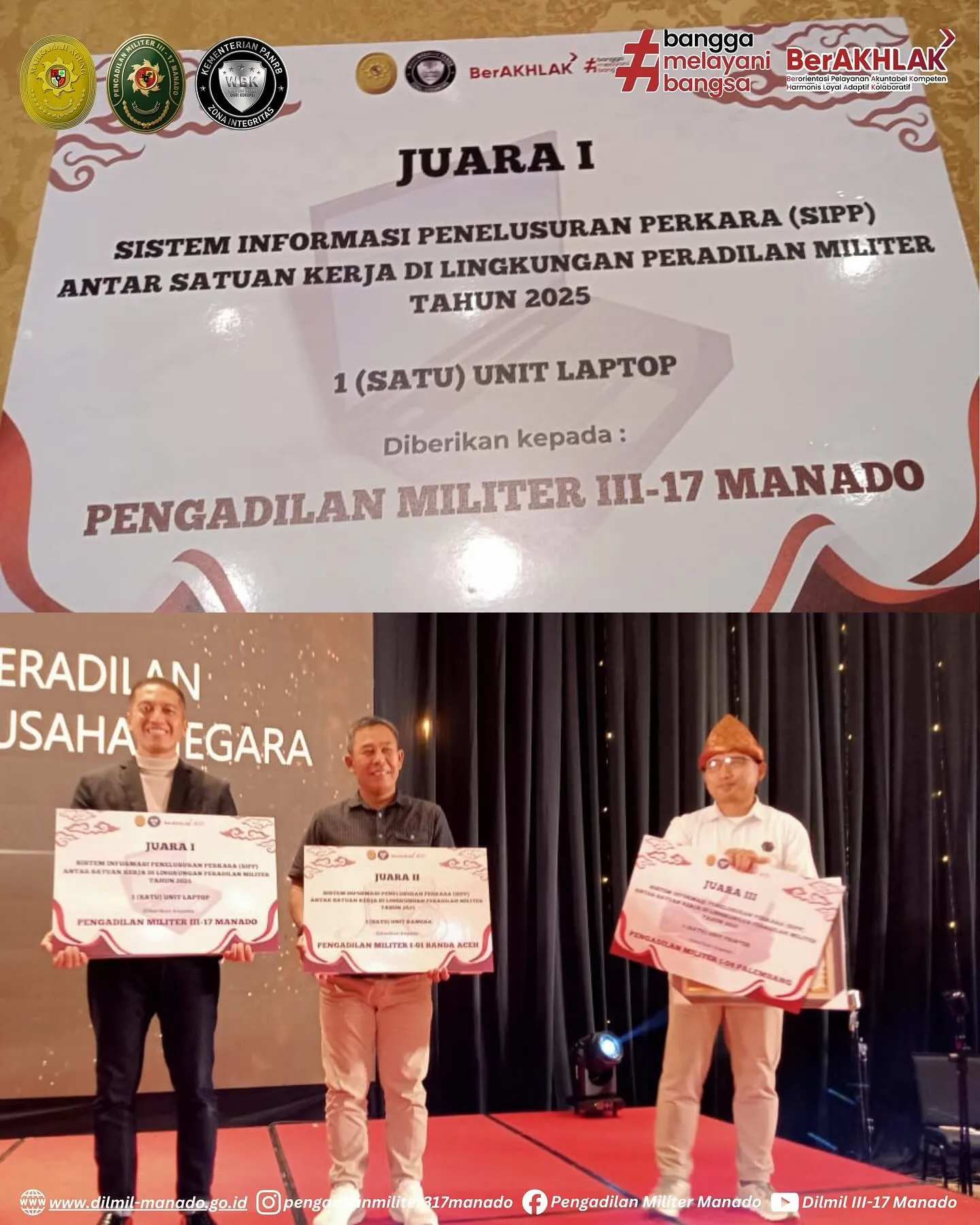 Pengadilan Militer III-17 Manado berhasil meraih Juara 1 dalam Lomba Sistem Informasi Penelusuran Perkara (SIPP) antar Satuan Kerja di Lingkungan Peradilan Militer Tahun 2025, yang diselenggarakan oleh Direktorat Jenderal Badan Peradilan Militer dan Peradilan Tata Usaha Negara.