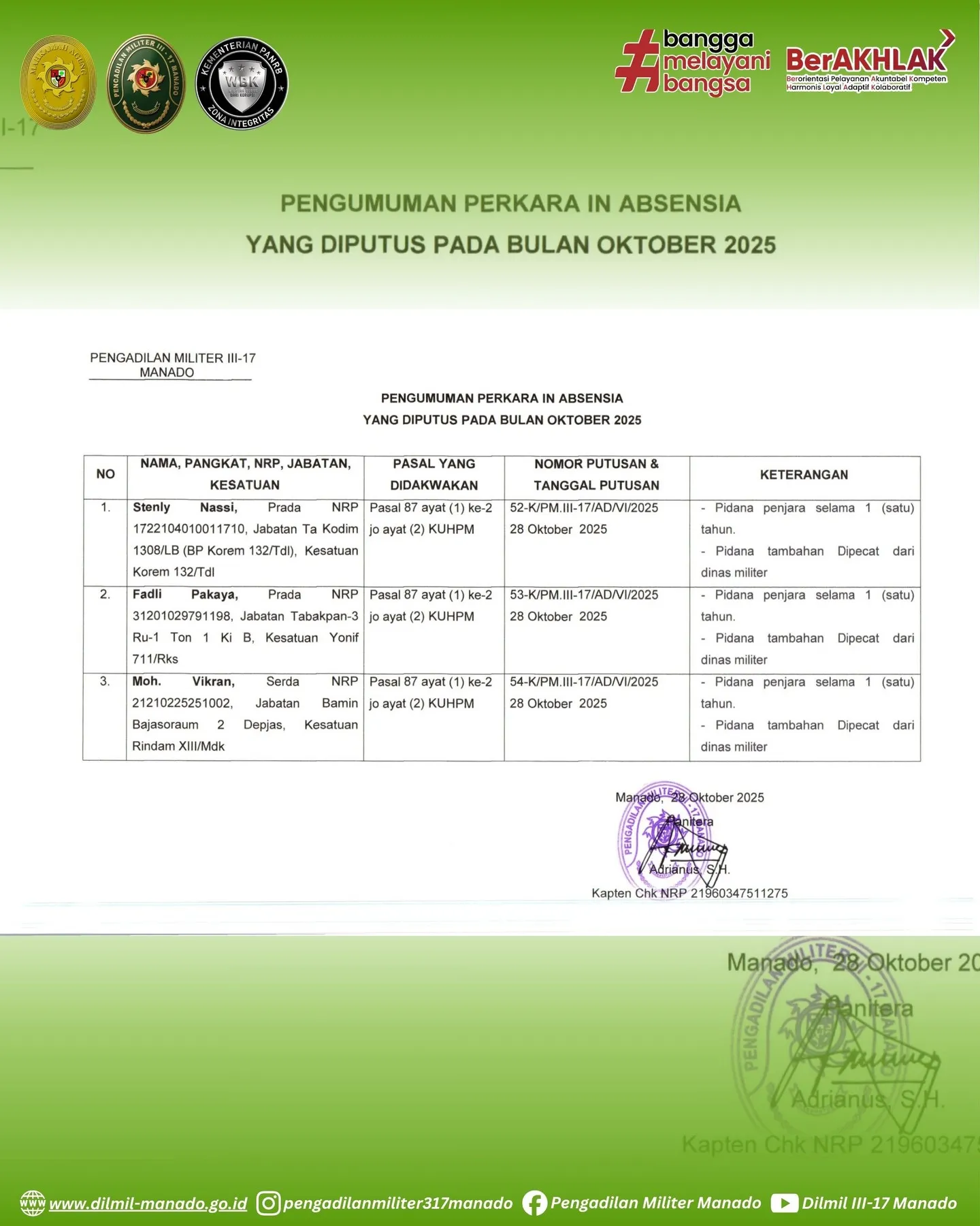 Pengadilan Militer III-17 Manado melaksanakan pengumuman perkara yang diputus secara in absensia pada bulan Oktober 2025.